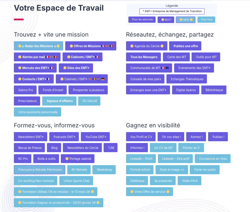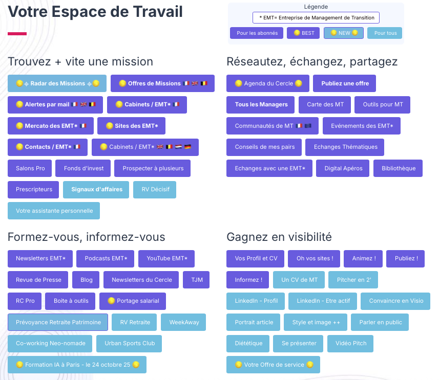 Voilà la “console de pilotage” conçue pour les Abonnés au Cercle et, en bleu foncé, les services dont ils profitent chaque jour.